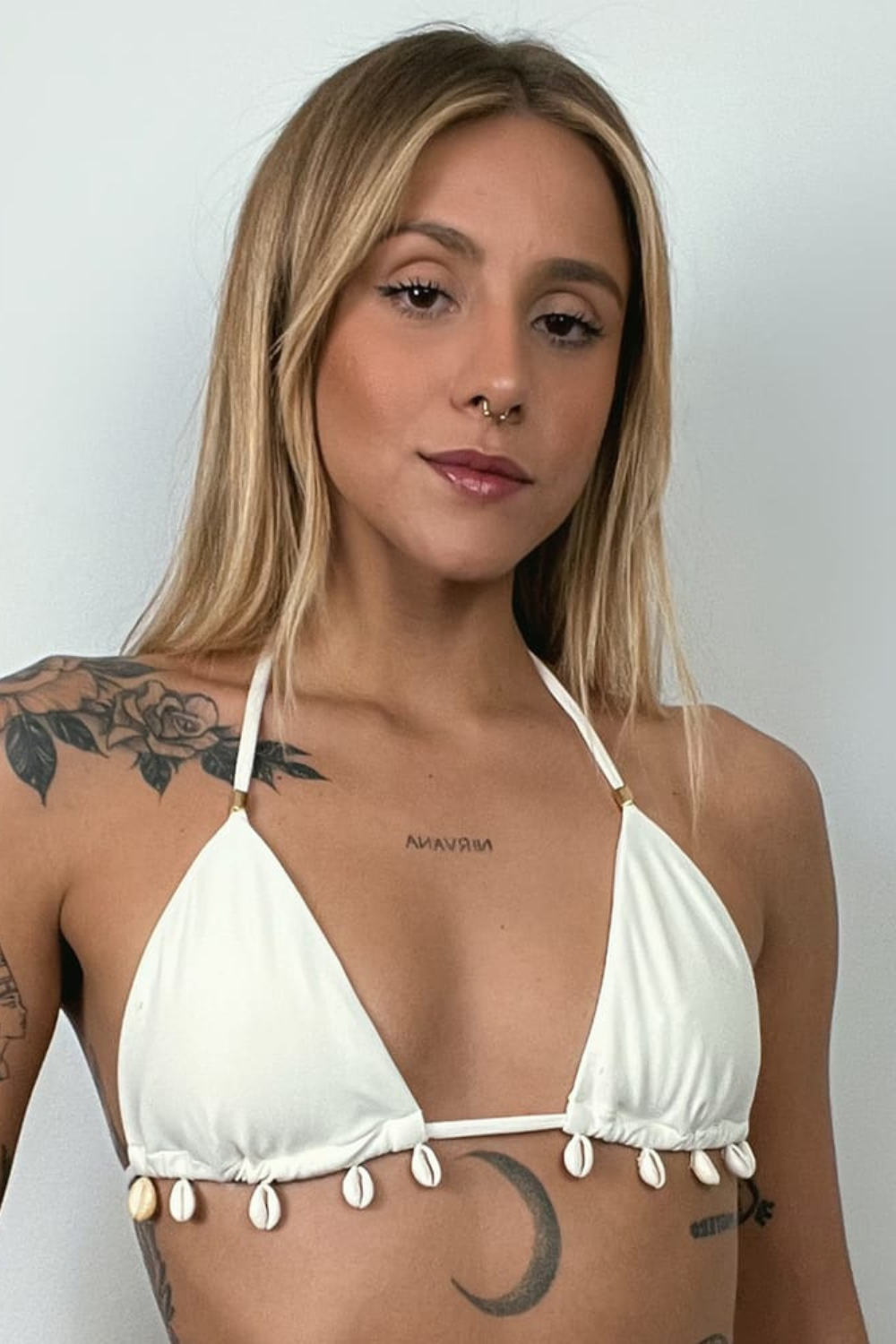With removable, flexible cups that do not absorb water. Bikini with a string-style design, featuring a shell detail at the bottom of the top.