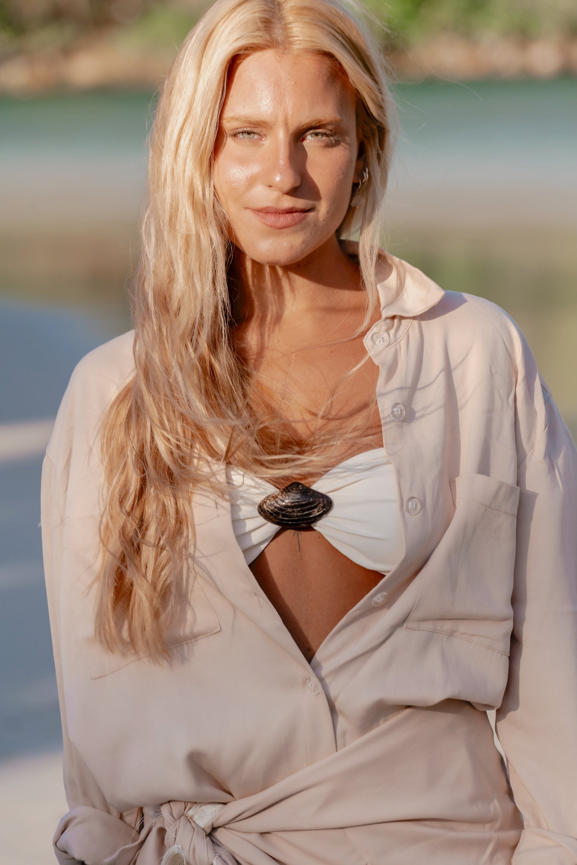 The wrap skirt ties delicately at the waist, allowing a natural, adjustable fit, while soft off-white fringe along the hem adds subtle movement inspired by ocean breezes. Paired with a timeless button-down shirt, the look feels effortless and feminine, worn open, knotted, or layered to suit the moment.